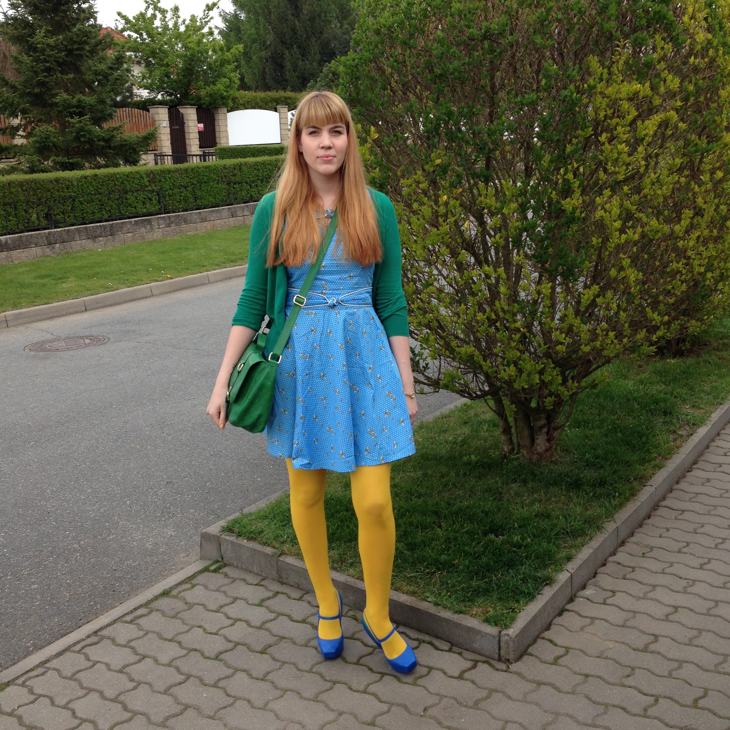 Let’s talk about this dress for a moment – it’s by Trollied Dolly via Asos. The dress has a bit of a retro feel to it but the print is really what captured my attention. The print is called “Honeybee” and yes, it has little bees all over. I don’t really like bees in real life but in print they’re perfect. Because there’s a bit of yellow to the otherwise blue dress, I decided to pair it with my yellow Asos tights. I knew I wanted to wear my green Zara cardigan and my green H&M satchel bag and then I was wondering which shoes to choose to complete the look. Oh and I also wore my Asos vintage watch and a pair of Asos rabbit earrings.