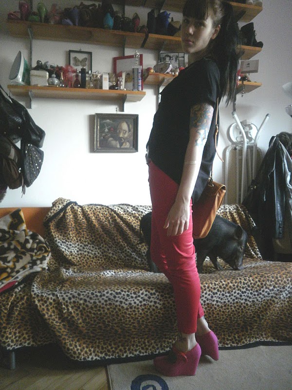 OLYMPUS DIGITAL CAMERARed leather pants, slouchy cropped in the front shirt, a favorite bag. The old outfit was quite fierce, no? (Sorry for the crap quality of the photo and hey, it’s the old flat!) I think  I may prefer the old outfit (because I may have over-done it with the pink this time) but I think both are at least a little similar (tight pants, loose top). I’m certain I’ve worn the shoes with a dress or skirt before but I couldn’t find a photo. I have to go pack now — I’ll be back next Tuesday but I think I’ll manage one or two posts  from London, fingers crossed.