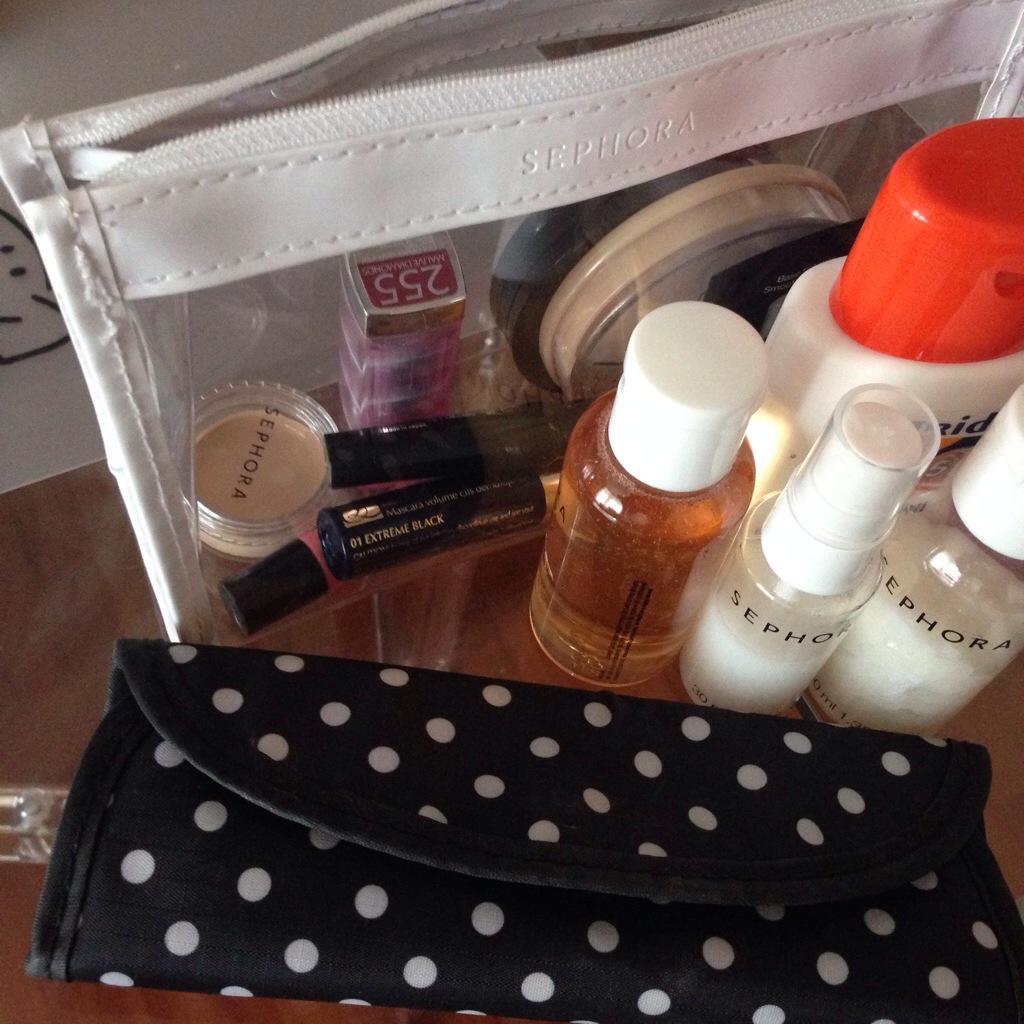 The rest of my make-up: Benefit gel eye-liner (the mini version), some mini mascara (can’t remember the brand), Sephora eye shadow, Rimmel powder, Benefit mini lip stain, a lipstick. A set of brushes in a cute polka dot case. And that’s it. Essentials really. I like to keep this simple for my vacations. I don’t pack any skin care products with me, just make-up removal napkins (Nivea). Oh and some sun tan lotion…