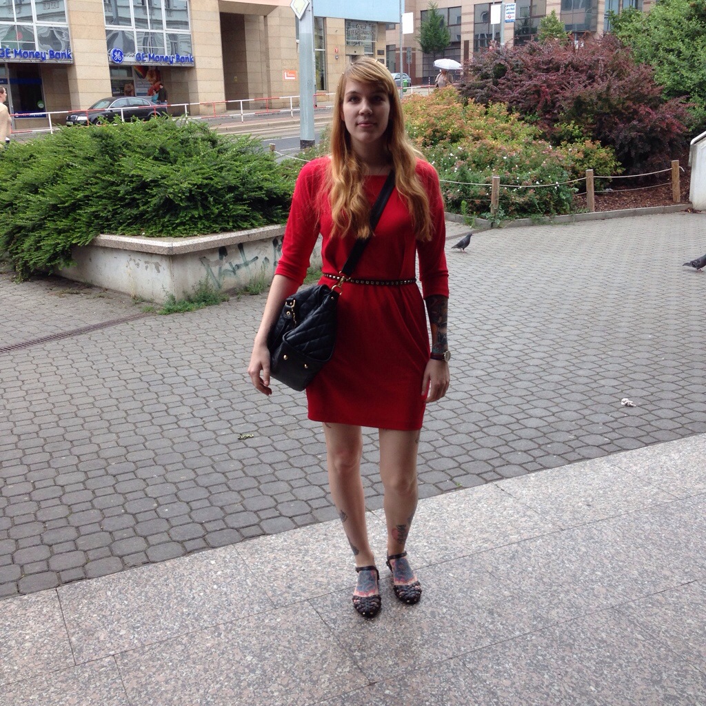 Another OOTD from right before our London trip (Sunday the 29th of June – lunch date). A very simple outfit too: red jersey dress (Mango outlet), Mark B bag, H&M studded belt, Asos studded headband, Asos mustache watch and a pair of studded sandals (Park Lane).