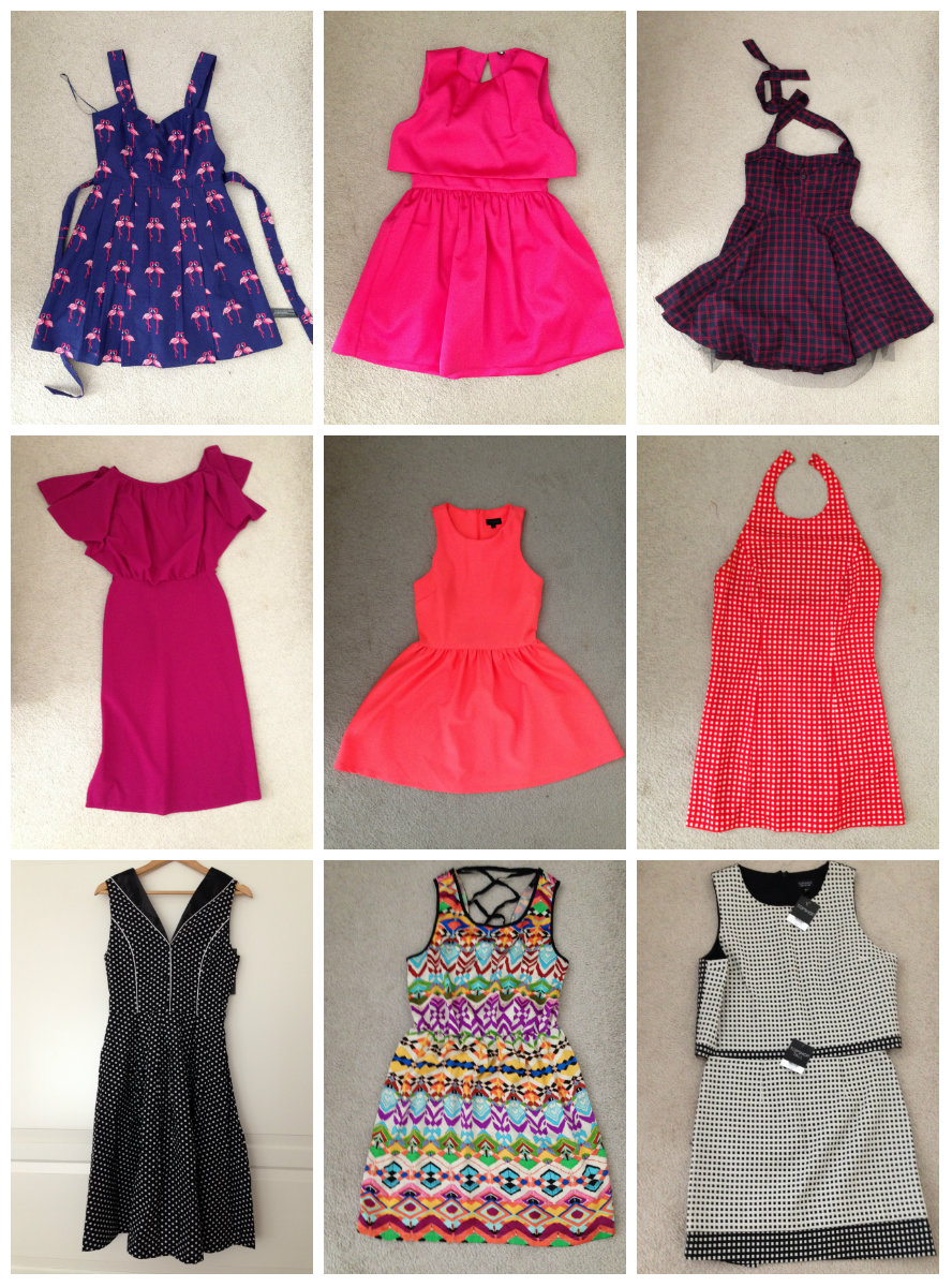 Besides the dresses mentioned in my last post, I also bought some shoes (the 6 pairs pictured above), a cheap parka from Primark, a super cheap black miniskirt from Topshop, a petticoat, a real leather jacket, a lipstick, 3 books, 2 magazines, loads of tights, a lip balm and a pillow case. Phew, quite a list right?
