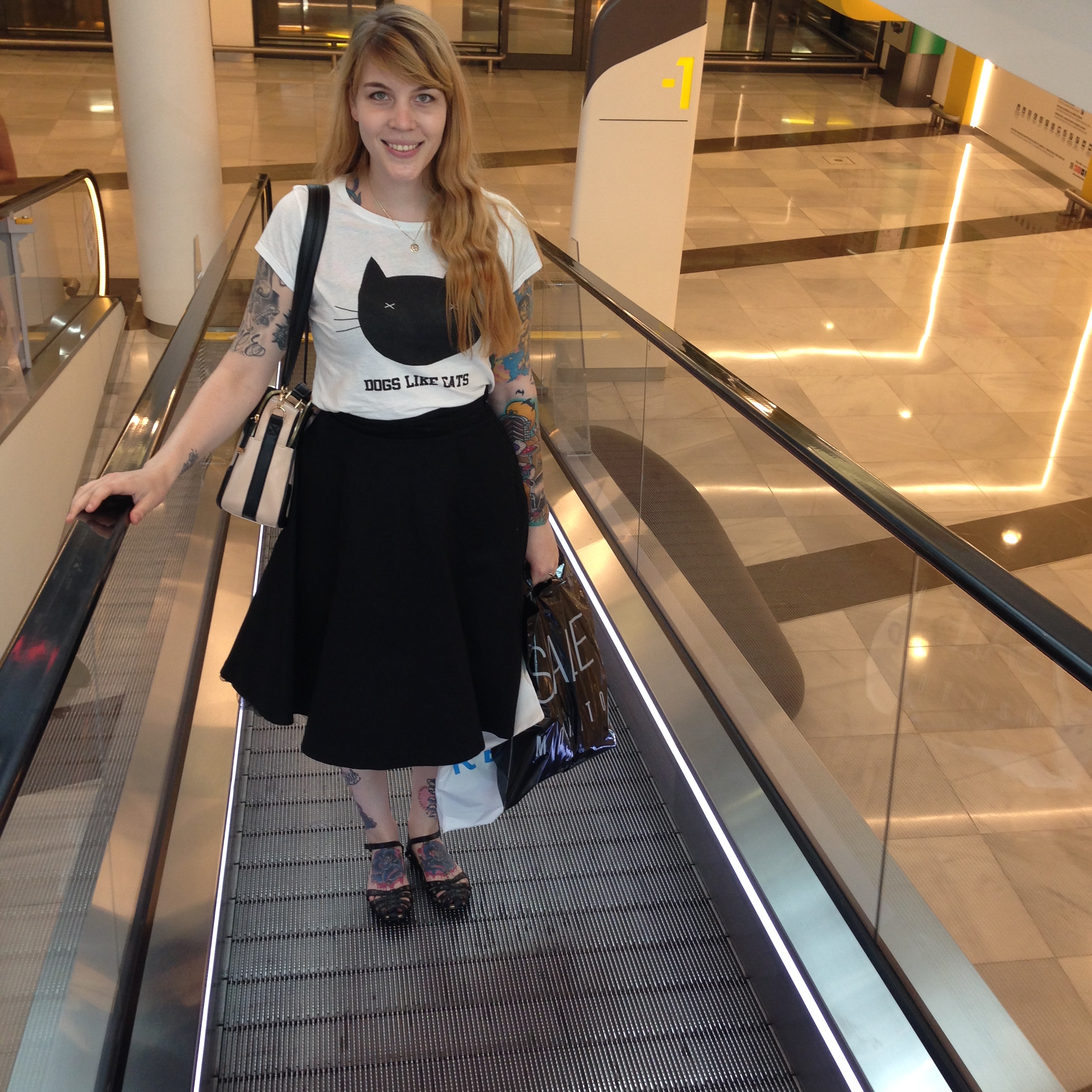 The first outfit is from July 19th, Saturday. We went to do a spot of shopping and I bought most of the second outfit. But let’s not get ahead of ourselves, so, this outfit is really simple but has some nice elements to it and it’s pretty much my favorite of the bunch. The skirt is from H&M and it’s really old, my shirt is from Zara and it features a cat face and a slogan saying “Dogs like cats”, my bag is from New Look and I’ve blogged about it before here, here and here. Last but not least, the shoes are Park Lane and you’ve also seen them on the blog before (here) but I hadn’t posted a product photo. They’re just a simple pair of flat sandals but have some nice studded detailing going on. Oh and I was also wearing my petticoat under the skirt to give it a nice full shape.