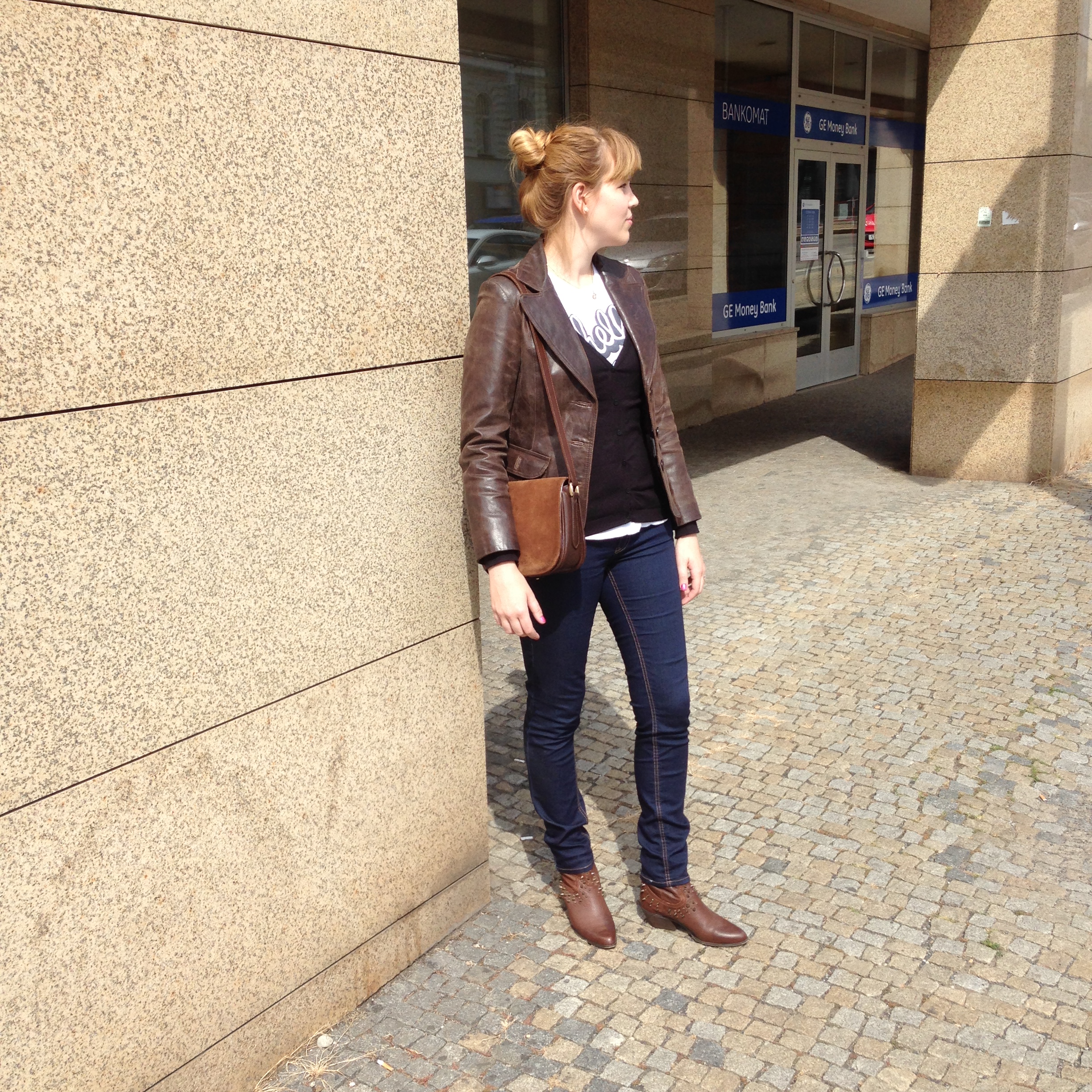 This outfit is from Sunday and was created around this leather jacket. (I bought the jacket in Camden for ten pounds, crazy!) I knew I wanted to wear the jacket (it’s finally the perfect weather for it) and so I went for a very simple outfit underneath – t-shirt and a black cardigan, skinny jeans – then it was just a question of shoes and bag: