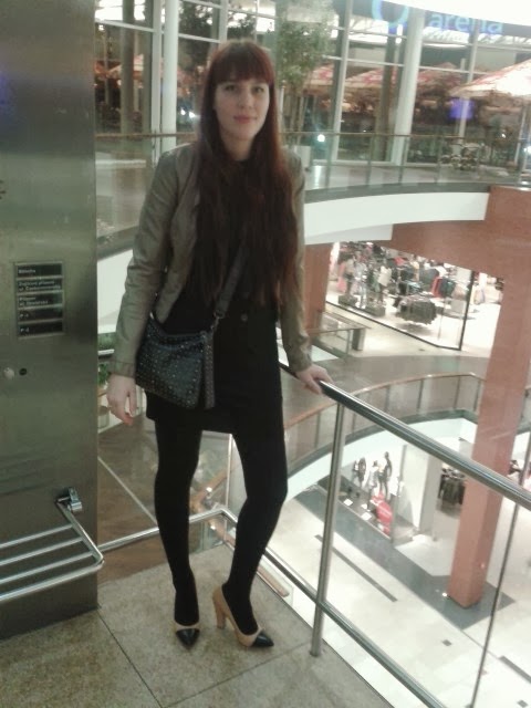 stradivarius studded bag, zara cap toe heelsI first chose the dress (pictured below), which is a really simple Zara dress. It has a lovely bright yellow color and is pretty easy to wear (though it did yet really wrinkled during the movie or the drive to and from the cinema. As almost always, the outfit photo was taken when we returned to our apartment building.) I then decided I wanted to wear my seriously studded belt (Zara) and then I just chose a studded bag and my favorite pair of studded slipper shoes. The bag I wore (which you can’t really see in the outfit photo, sorry) is from Stradivarius, it’s really old and I couldn’t find a photo, other than the one above, where you could really see it. Basically, it’s just a simple black bag with dark silver studs on it. I wore a gifted bracelet that I really love. I got it from M‘s parents like two years ago? It’s chunky and awesome and I need to take a proper photo of it. Next time. Oh and I also woremy trusty black pashmina and black Pull & Bear cardigan.