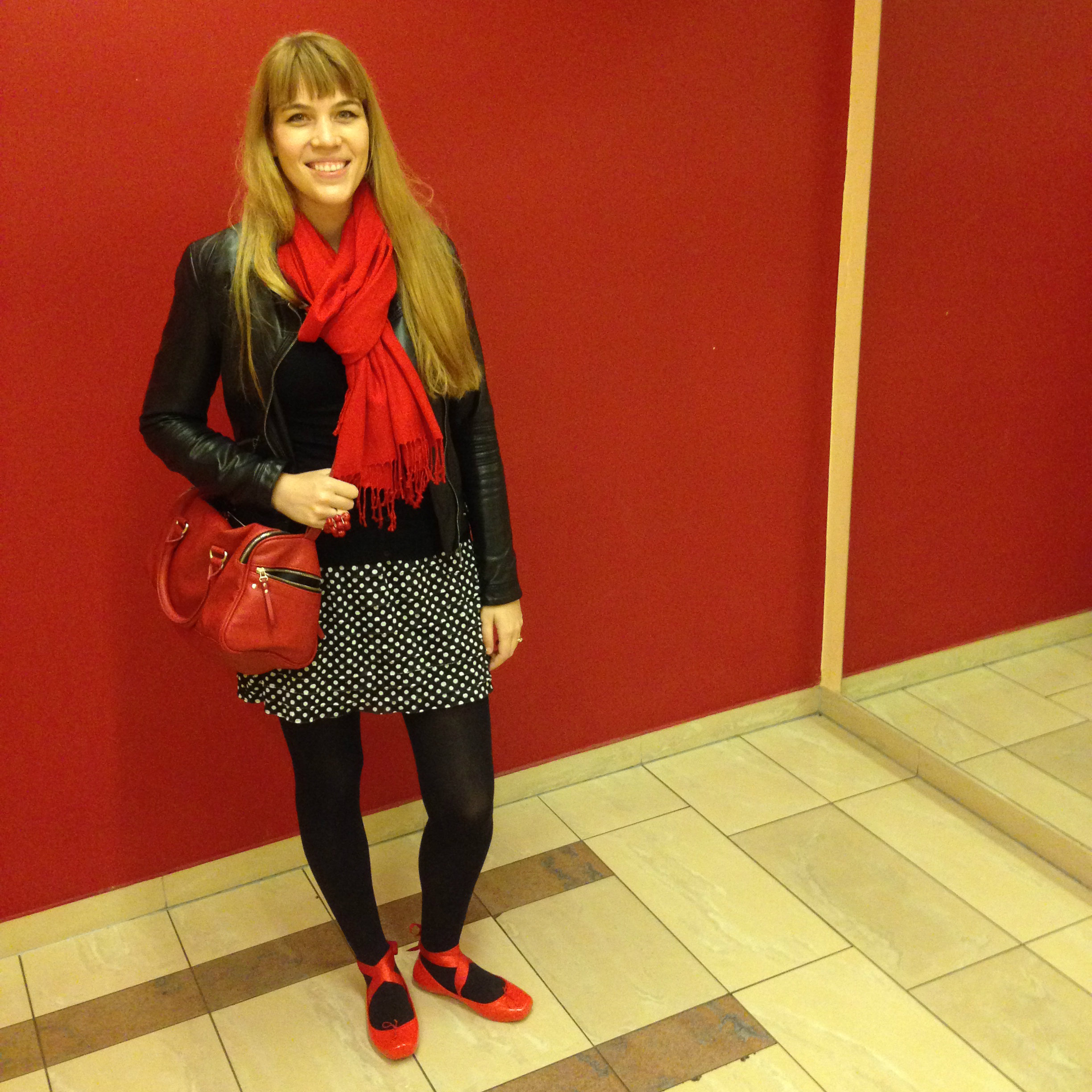 The dress is from Promod and I love that it has bought polka dots and stripes. However it has gotten colder so I wore it with a black (Pull&Bear) cardigan. I guess I usually do wear it with that cardigan, ha, as you can see in the photo below. I also threw on my red pashmina scarf. I honestly don’t know what I would do without these scarves! They are life-savers for me because I am constantly cold! (I need to get more colors though, I really want a green one!)