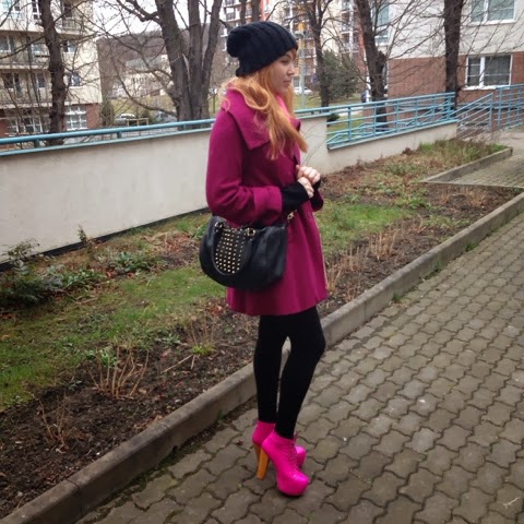 jeffrey campbell lita neon pink plus pink coatOutfit details: H&M fuchsia coat, pink pashmina, Zara hat, Topshop pink and white dress (which you can’t see), Pull & Bear black cardigan, H&M studded bag.