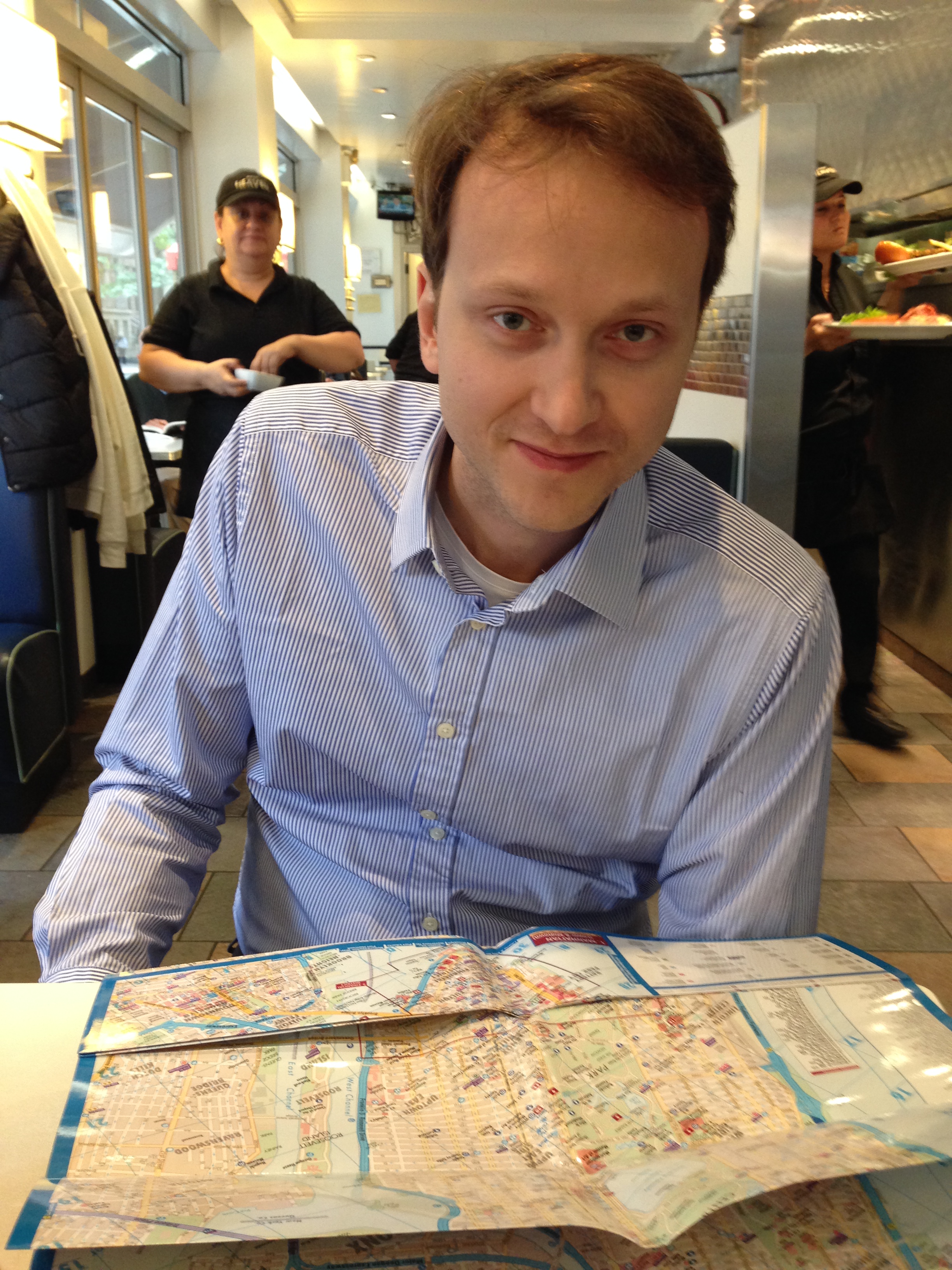 I think they should change that saying into “as busy as a person visiting New York City”. Anyways, our weekend was extremely super busy. We paid for a three day New York City Pass and we started using our cards on Saturday – we visited MoMA and the Met and also stopped by Central Park and picked up tickets for the next morning to visit the Top of the Rock (it was a rainy day and they had said that the current visibility was zero.) On Sunday, after breakfast we went to the top of the Rockefeller building (luckily it was a beautiful sunny day), then we went to the Intrepid museum, then we went to Central Park and crossed it to the Natural History Museum, and later still we went to the Empire State Building. Phew, Sunday was the busiest day. Anyways, the photo above is from this little diner where we went to hide from the rain and also to experience a true American breakfast. This was my meal (though I gave M half my eggs and all of the sausages and the bacon) and I had a vanilla shake. I must say pancakes and maple syrup are THE BEST BREAKFAST EVER.