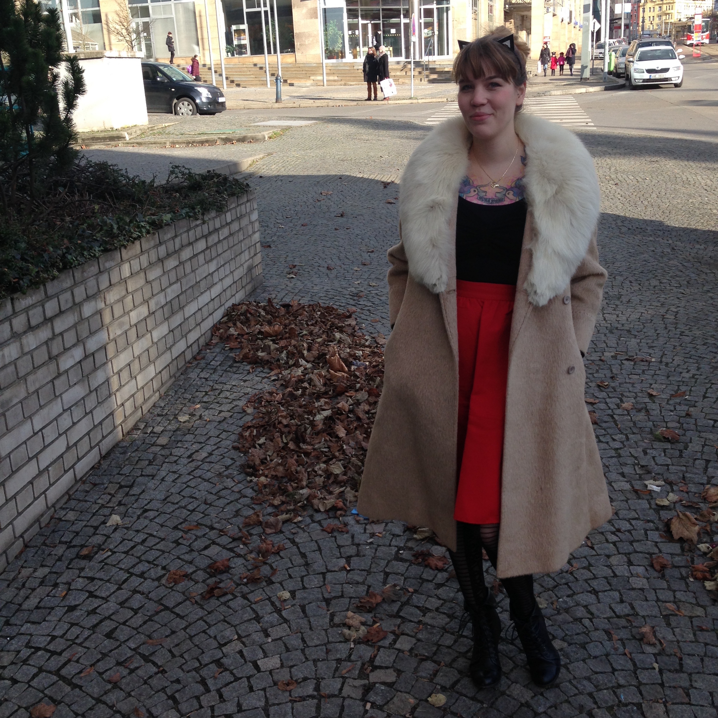 This outfit was worn a few weeks ago. It was cold outside but I wanted to wear my red midi skirt and I hate the idea of wearing a midi length skirt/dress with a shorter coat. Though it can work in some cases, in most it just makes me feel like a bag lady. Actually, the whole outfit started with a pair of tights I received for Christmas from M’s mum. I have this thing where if I receive a gift I really try to wear it and show my appreciation for whatever it is that I was gifted so that it makes the person who gave it to me feel good about it, know what I mean?