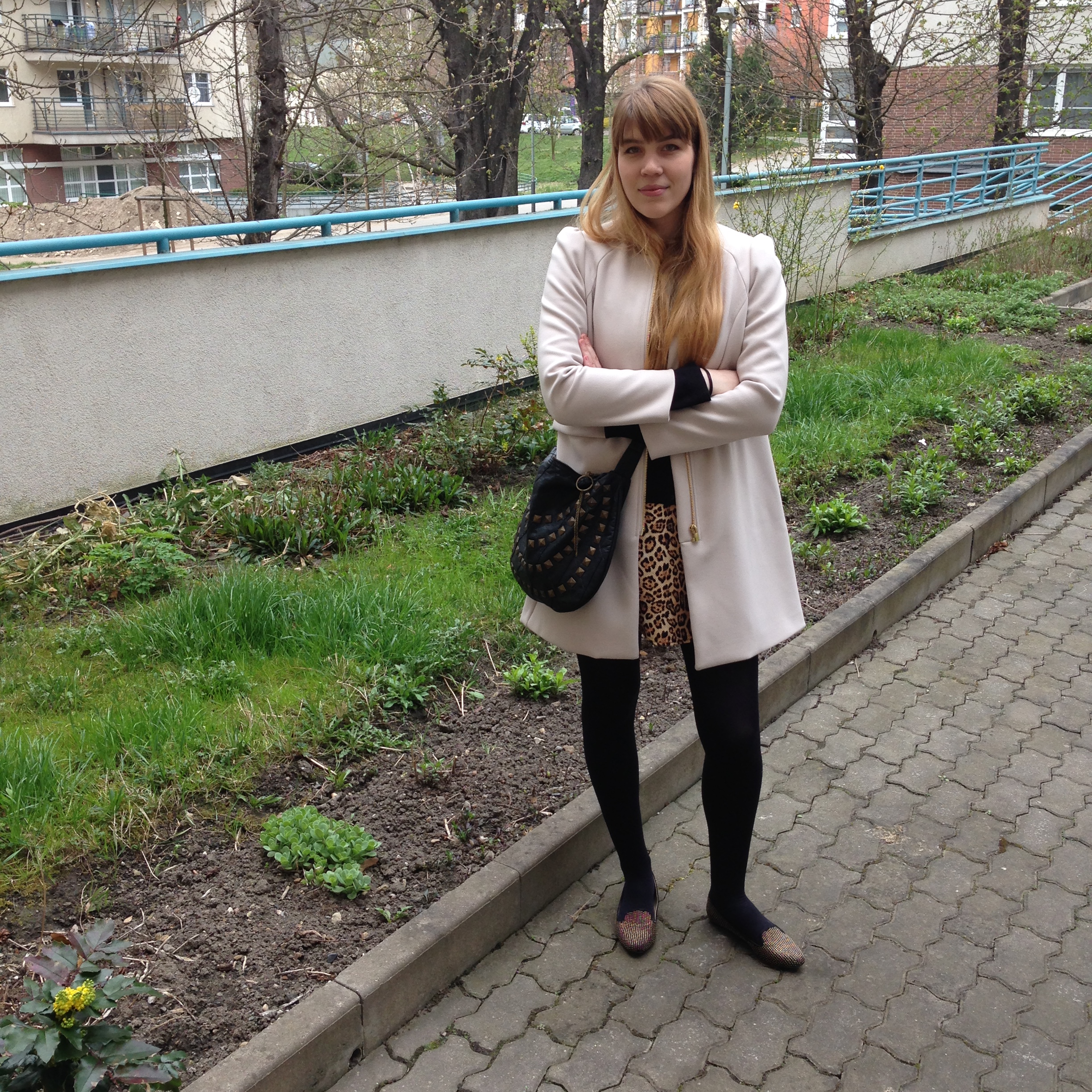 I then picked out this leopard print dress and my go-to black cardigan and the outfit was nearly complete. The only things missing were shoes and a handbag. Usually, when we go by car to have lunch I like to wear heels. But this Sunday we didn’t go to M’s parents’ flat for lunch and instead were meeting my bestie and going to our fave restaurant (that is close by). I just wasn’t feeling like wearing heels for some reason. Instead I decided to wear these Zara studded flats and then I just matched them with my super old Stradivarius bag.