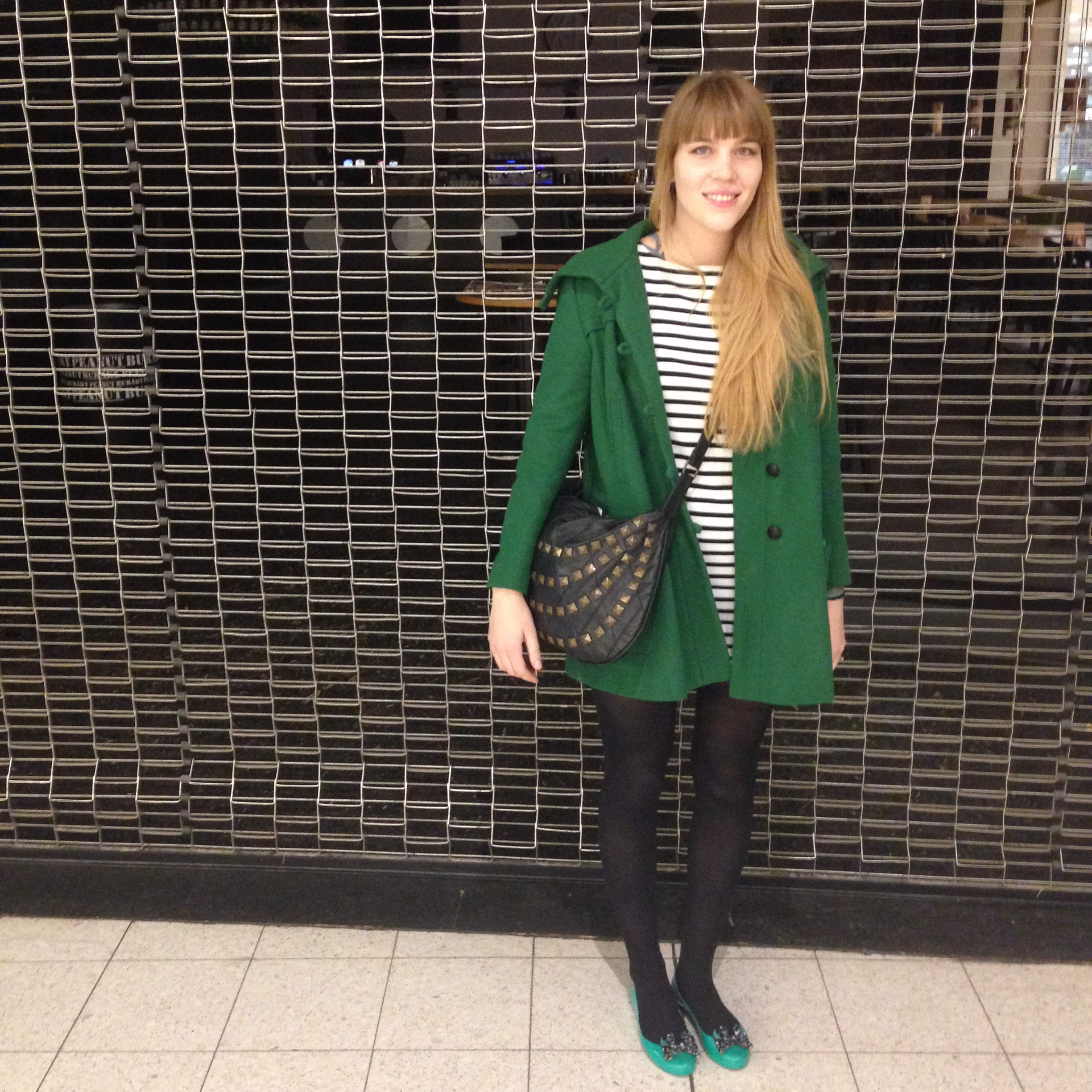 I planned my outfit around these Melissa shoes. Usually I wear heels when we take the car but I didn’t feel like heels. I just wanted something comfy and easy to wear. Plus I had a pair of new shoes that I hadn’t worn before so that’s always appealing to remedy. Then I just added an Asos stripped dress and an Asos (a few years old) green coat. The coat and the shoes didn’t match and normally that would have bothered me but I didn’t really care, it was a very throw-on-and-go kind of outfit so I didn’t over think it.