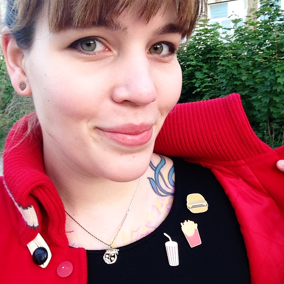 One of my favorite aspects of this outfit are the fun fast food pin badges from Asos that I added to liven up the dress. I wore tiny four leaf clover earrings from H&M and my necklace that I wear all the time. The lily charm I have had since I was born, the necklace was a gift from M (after my old necklace broke) and the pig charm was also a gift from M and it’s from our trip to Vienna in December, after Dracul passed away, to remember him by.