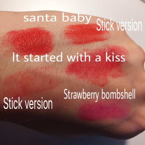 You can see my swatches here. Santa baby is a lovely red, the stick version and the older version are almost identical except the older version was slightly drier, the new version is more hydrating and I love it. It Started with a Kiss is quite different from the old version – you can see that the pigmentation is much lighter in the new stick version.