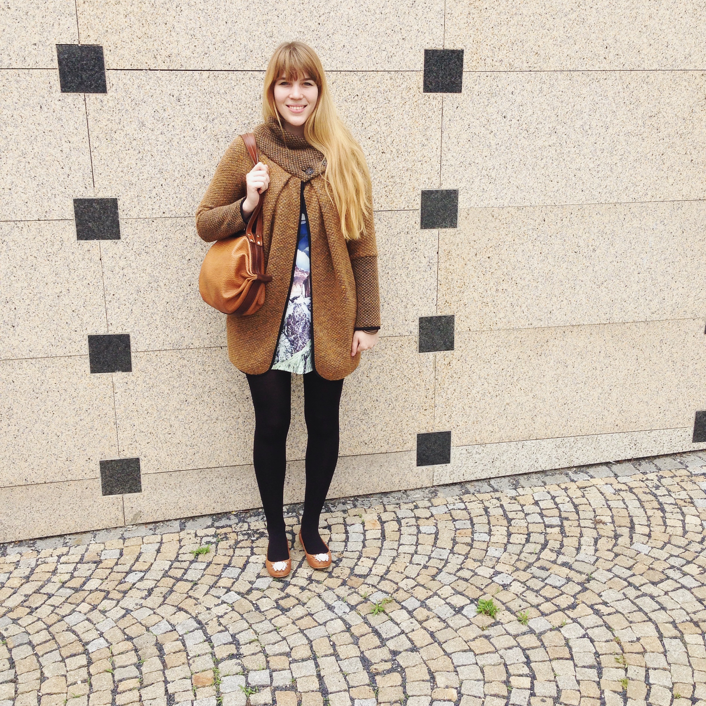 IMG_7569Hello everyone, sorry about being so spacy this week. To top it off, I wore some really great outfits to work this week and didn’t get a single photo, arrgh. But here’s an outfit from this past weekend, from Sunday when M and I went to his parents’ house for lunch. I wore my scenic mountain print dress, a sweater coat I bought in Vienna, my new Rome bag and these old Zara Woman leather ballerina flats with an interesting brooch detail on the front.