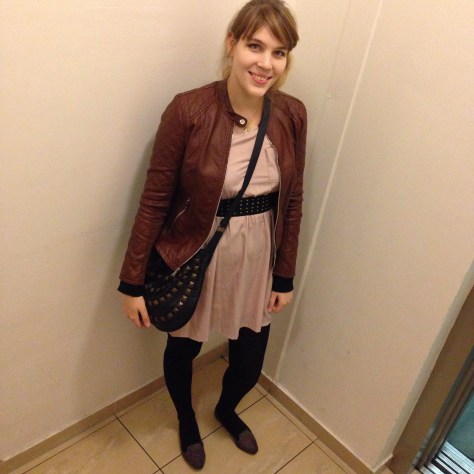This outfit came together on the basis of pairing neutrals together, I wanted to wear this beige dress (I’ll edit this post on Friday to add the product photos) and thought it looked good with the brown  jacket and the studded accessories. The dress was ordered on Asos (about three years ago) and the brand is called Angel Eye London. My belt is super old and from H&M and it came with a skirt, I love this belt and wear it very often. My jacket is from Express and my shoes are Zara. The outfit is from the 20th of June, I’ve been a bit behind on blogging. I wore it to the cinema to see Jurassic World. The movie was okay, I like the actors in it so that helped. Definitely wouldn’t go see it again but was a fun night. And I ship Owen and Claire. ❤️