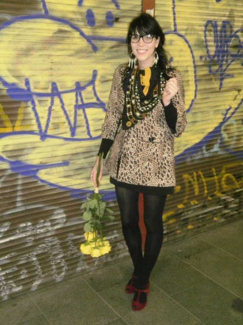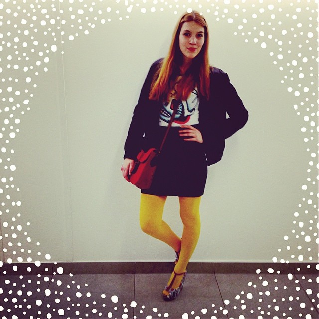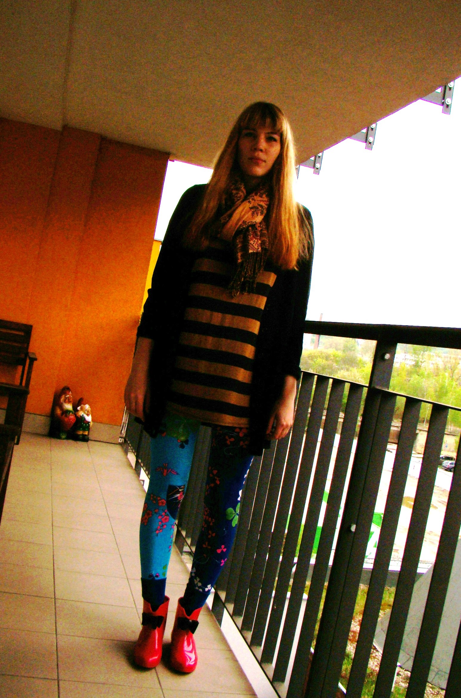 The outfit above was worn only to walk Mr. Pig and consists of one of my favorite swapped tops, which I often lounge in at home, a pair of crazy leggings from the Versace for H&M limited edition, the sweater is super old and is from H&M, the scarf is also H&M, I have no idea where the socks are from – actually I think I may have stolen these from M after they shrunk in the washing machine. And the fun bright rain boots are from Gate.